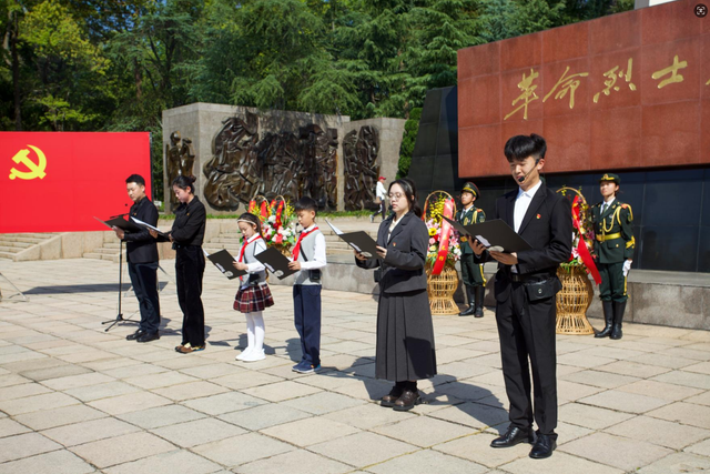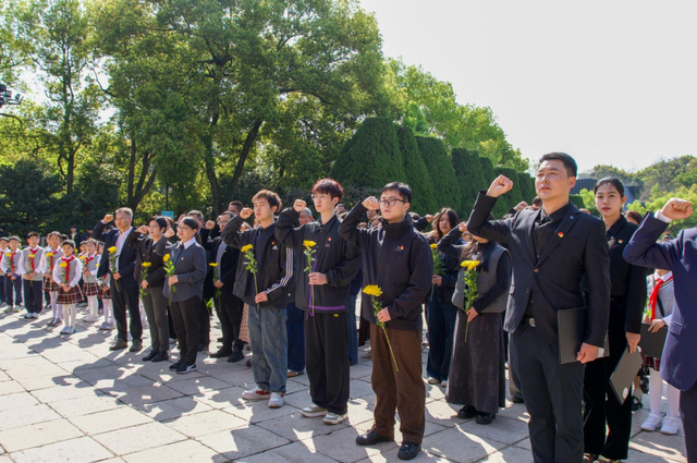 活动现场,杭电师生代表与附属小学的孩子们共同带来诗朗诵《致敬英烈赓续血脉》,以跨越代际的对话表达对红色精神的赓续传承。随后,全体党员面向党旗庄严站立,在孔万增同志带领下,重温入党誓词。铿锵誓言在陵园上空回荡,少先队员行注目礼,共同接受信仰洗礼。